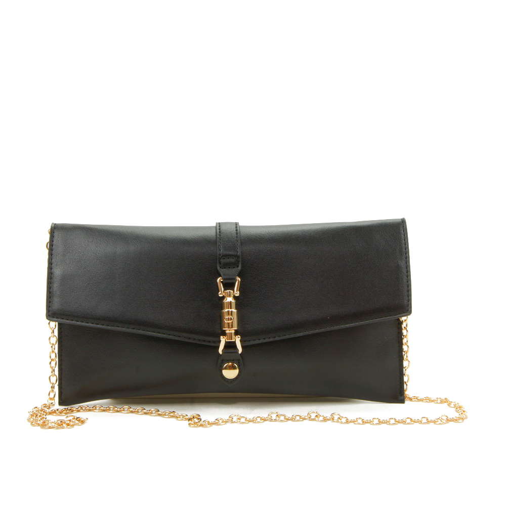 Bolso tipo cartera de fiesta, con cadena extraíble para llevarlo como bandolera. Cierre con imán.