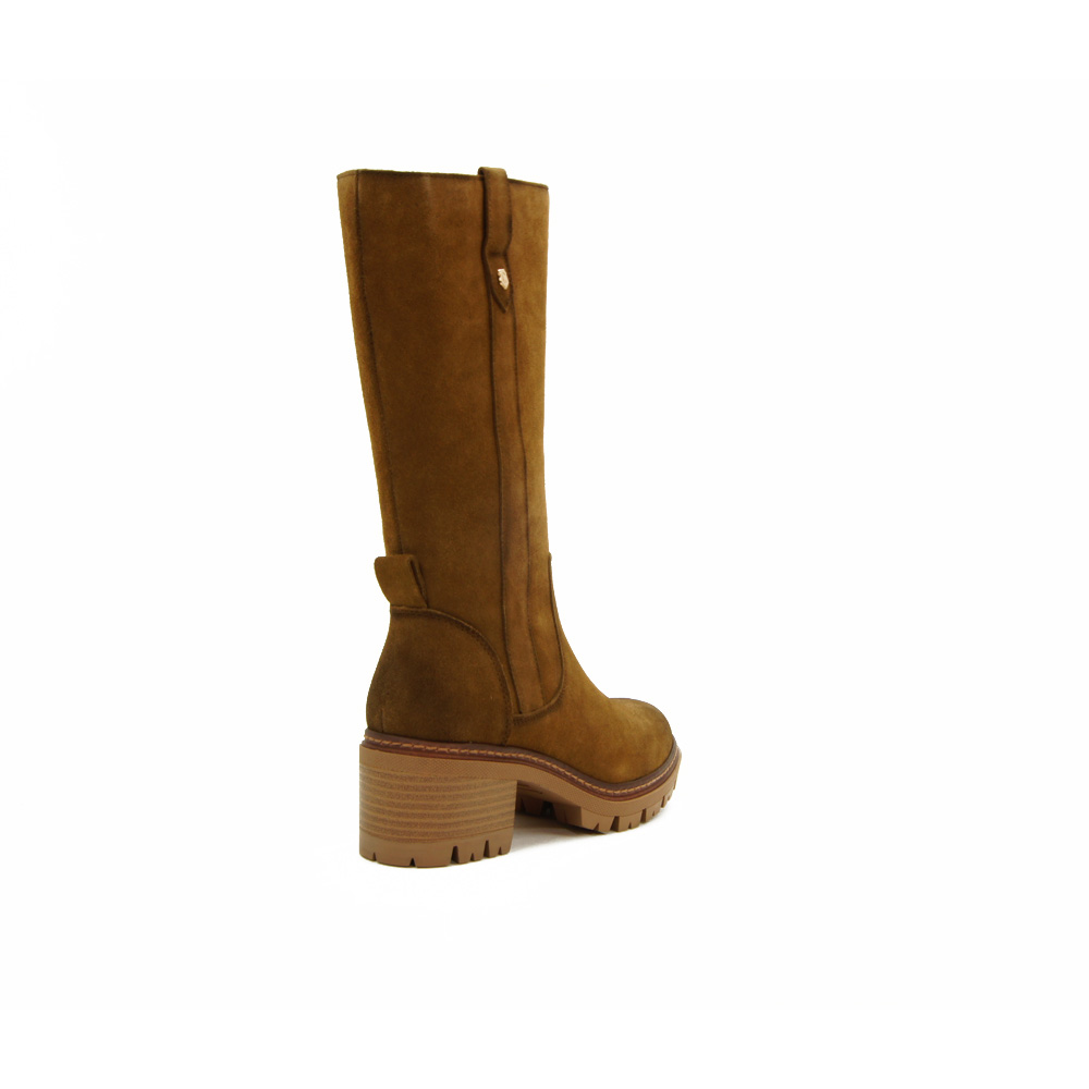 Botín de tacón ancho fabricado en piel de serraje. Ajustable con cremallera lateral y goma elástica para una mejor adaptación. Plantilla acolchada con suela flexible y antideslizante.
