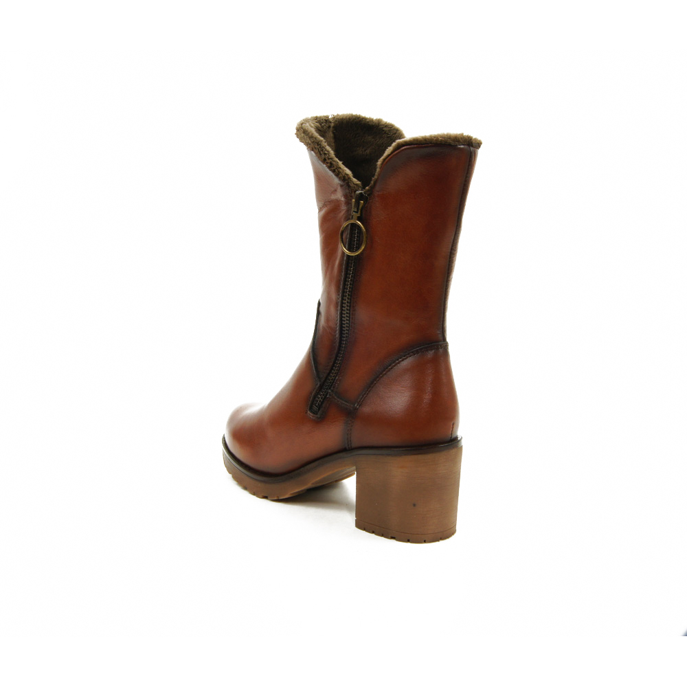 Botín alto de caña con tacón alto, corte en piel natural con forro interior. Con cremallera lateral para un mejor calce.