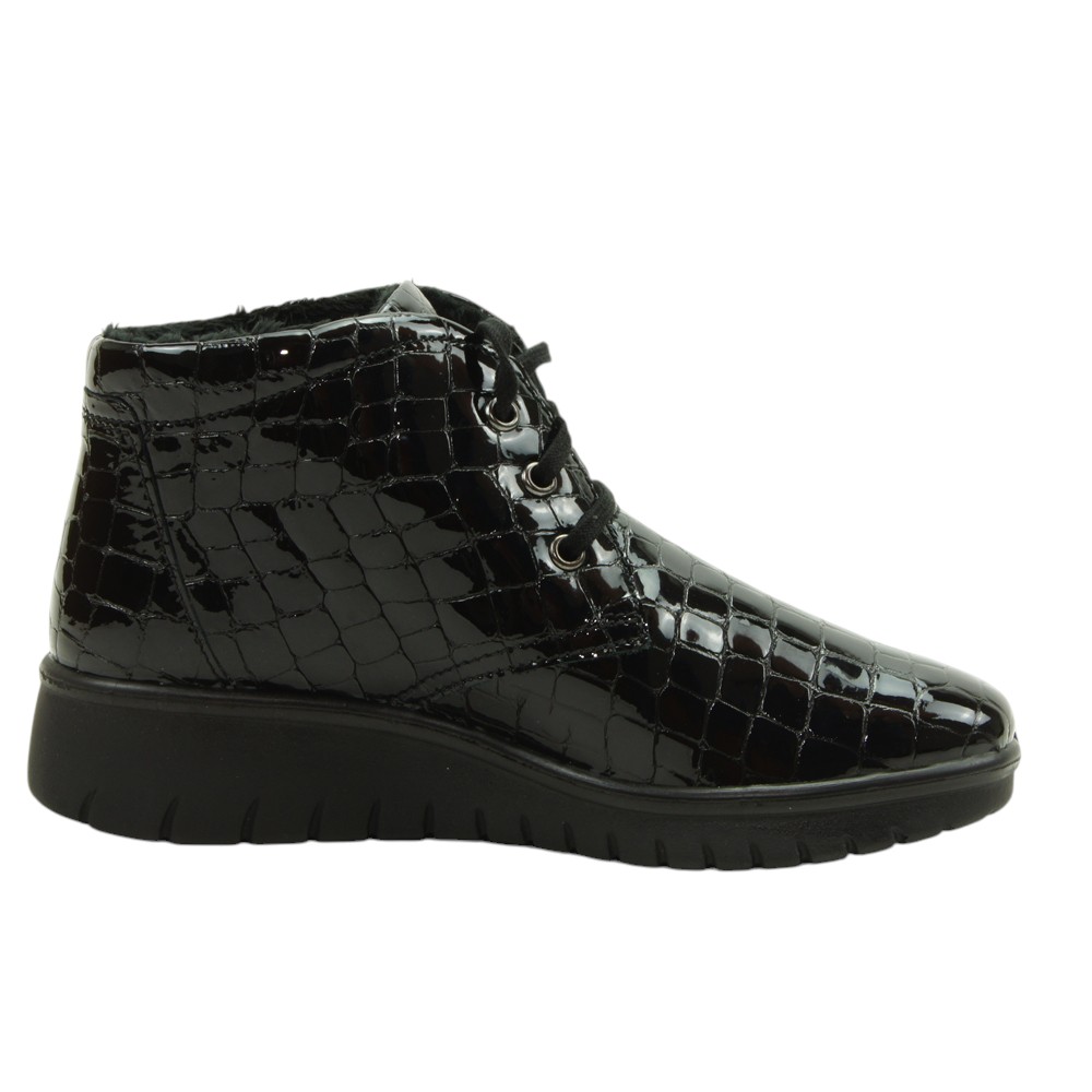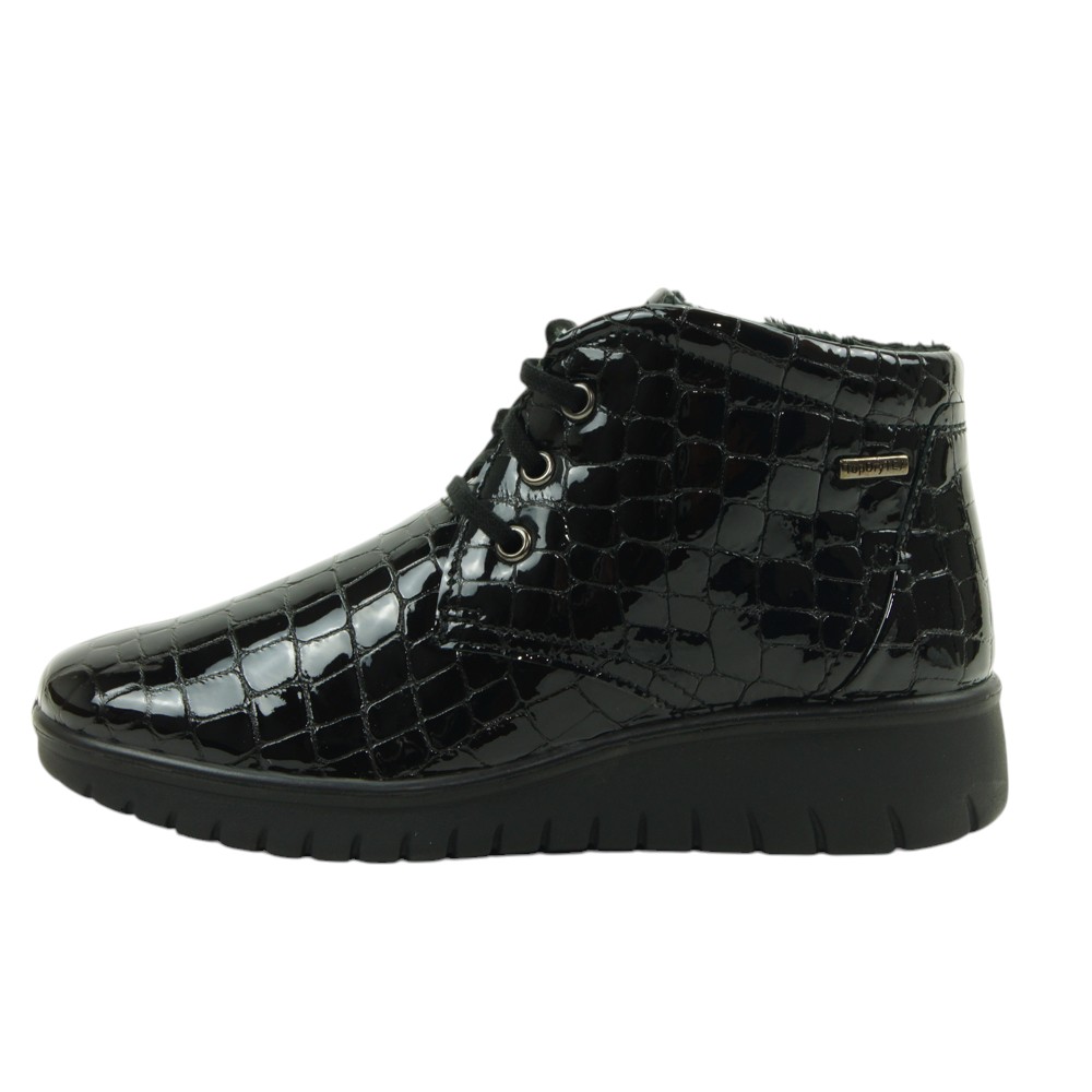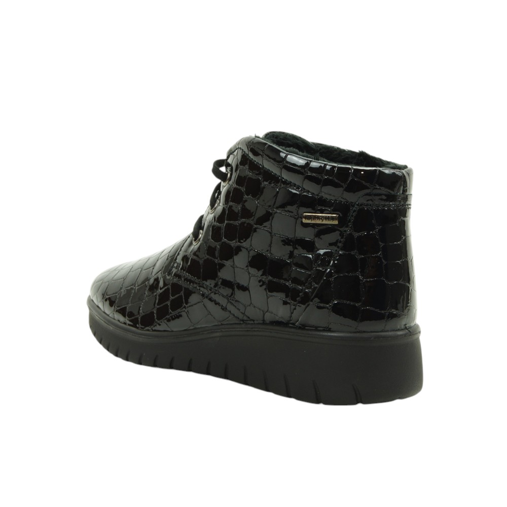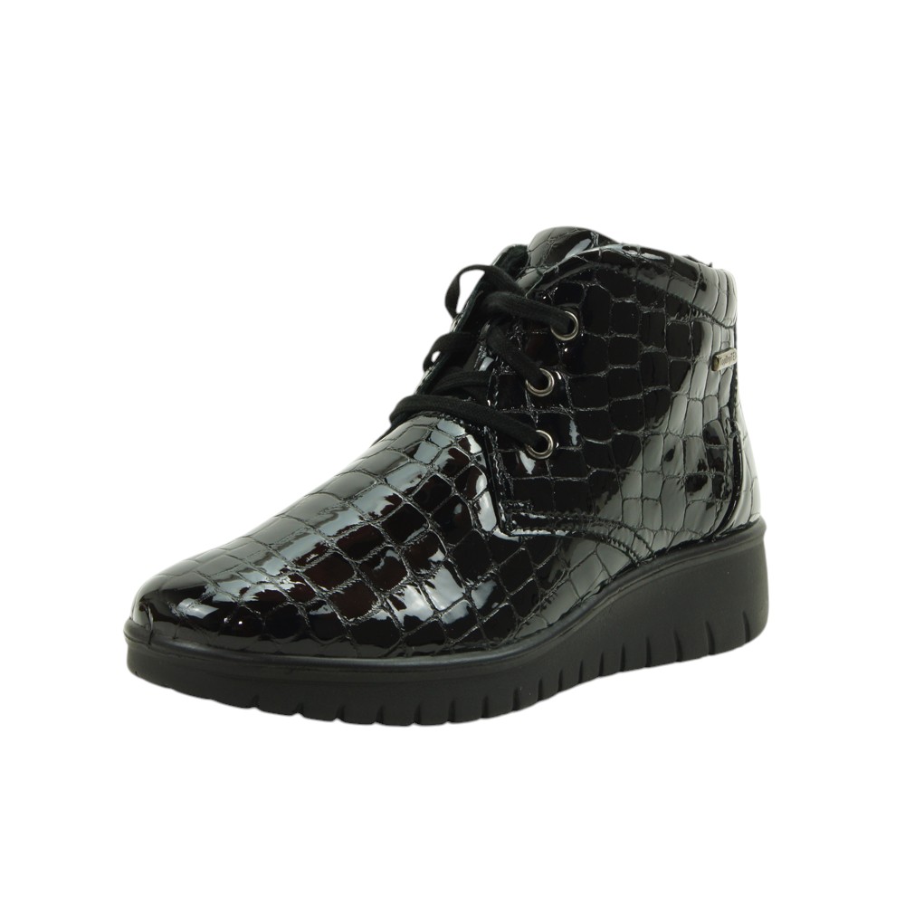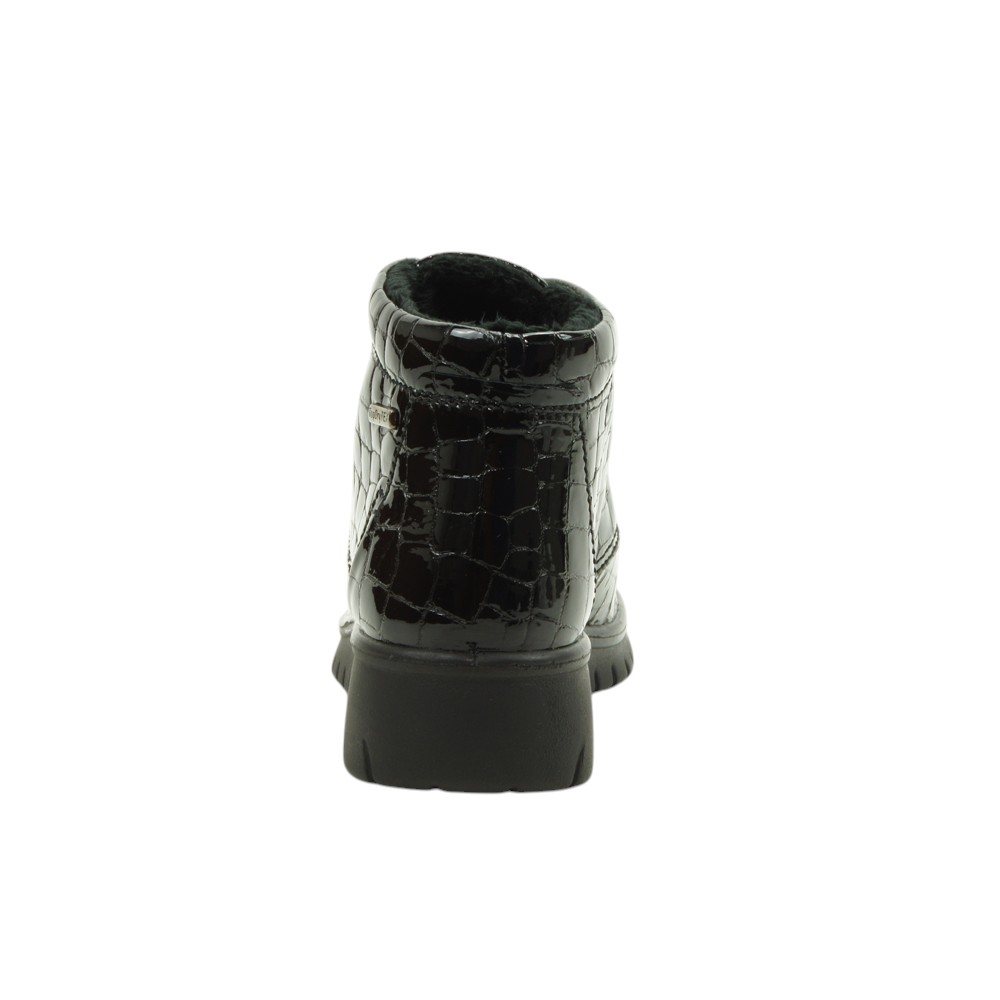 Éste botín de ancho especial y plantilla extraíble es ideal para asegurar el confort del pie incluso en las peores condiciones metereológicas gracias a su membrana impermeable y transpirable TOPDRY-TEX. El material exterior es de piel con acabado de cocodrilo. Forro interior en cálido y suave pelo. No tiene costuras en parte delantera y por lo tanto perfecto para pies con problemas de juanetes o dedos curvados. Ajustable con cordones.- 35