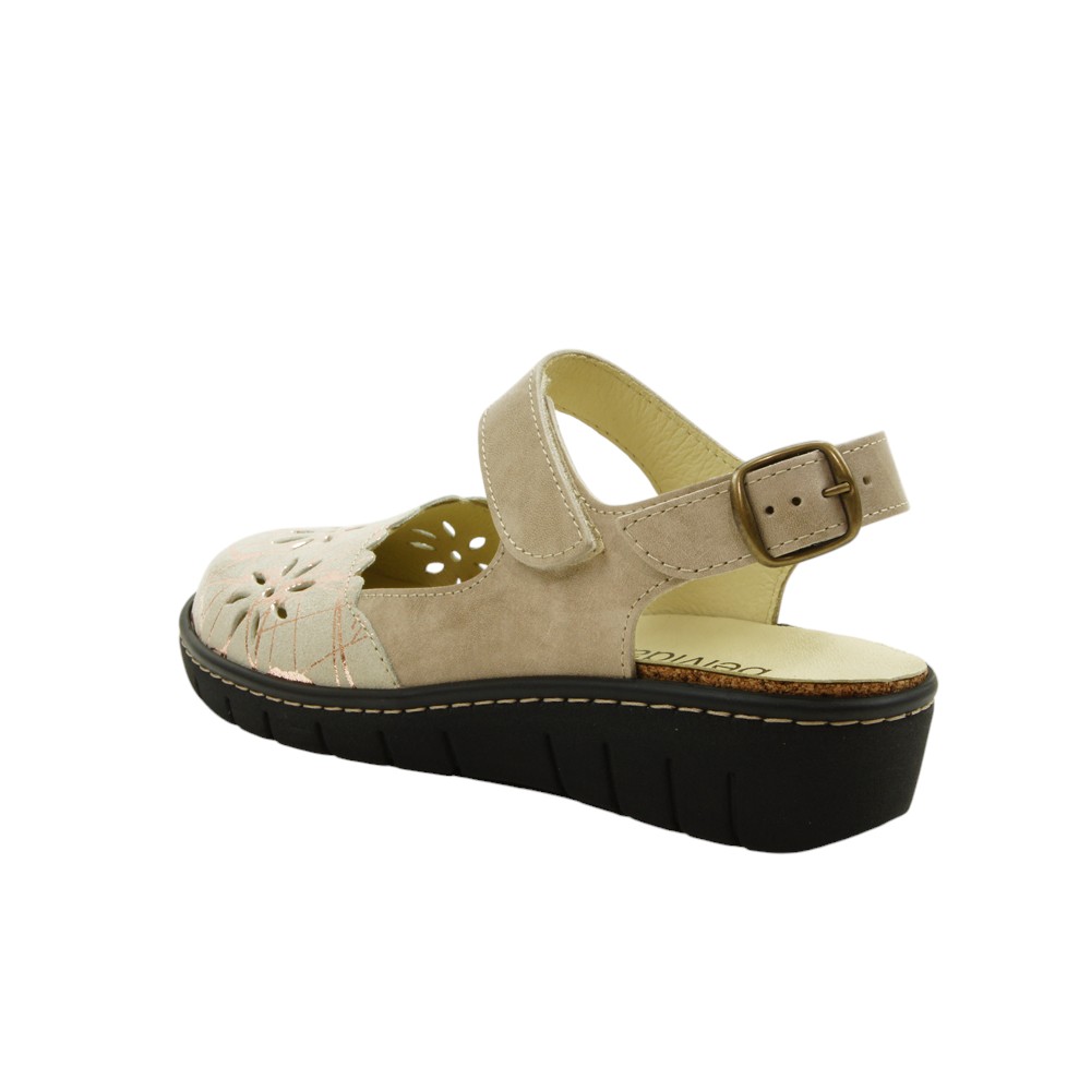 Mercedes con cuña fabricada en piel natural troquelada. Ajustable por su tira con velcro en el empeine y su tira trasera con hebilla. Dispone de plantilla extraíble que permite la colocación de una plantilla podológica. Suela shock absorber que protege de los impactos y proporciona un gran confort.-