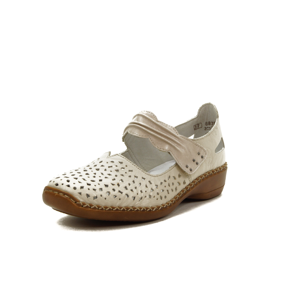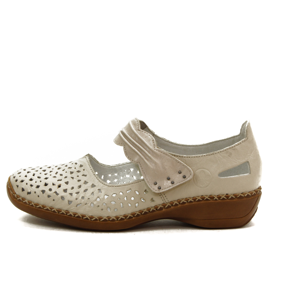 Zapato de la línea Rieker AntiStress diseñada y fabricada pensando en la comodidad, sus pieles naturales sin forro, su suela acolchada forrada de piel y la suela de poliuretano ligero cosida a mano, un modelo ideal para quien precisa de un zapato fresco y cómodo para la temporada de primavera-verano. Ajusta perfectamente con velcro.- 36