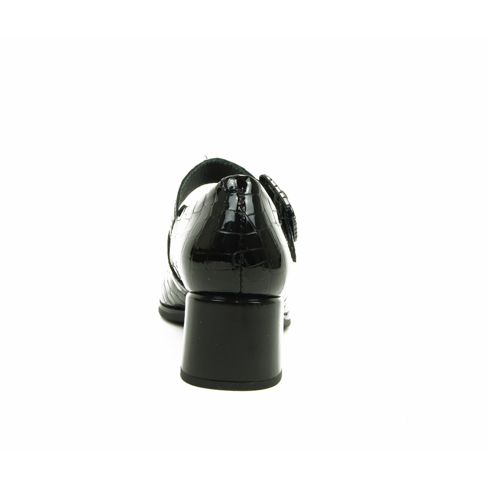 Zapato tipo merceditas de vestir cómodo de piel de coco en charol, con tacón ancho muy estable. Fabricado con pieles muy blandas, forros y plantillas intech transpirables hipoalérgicos.
