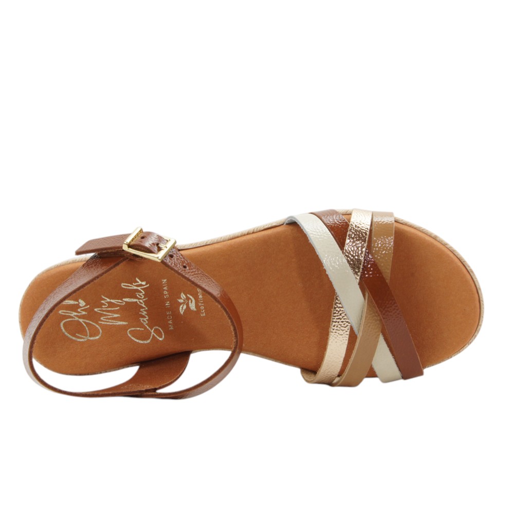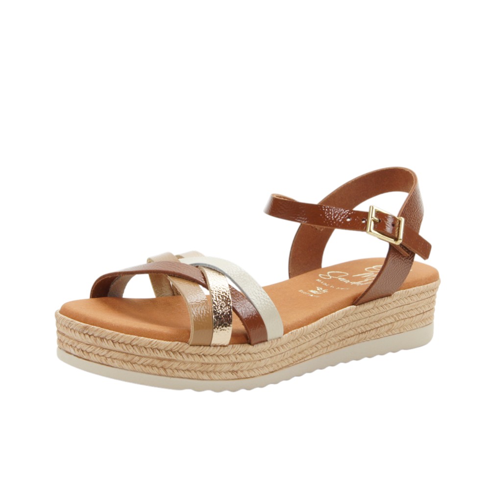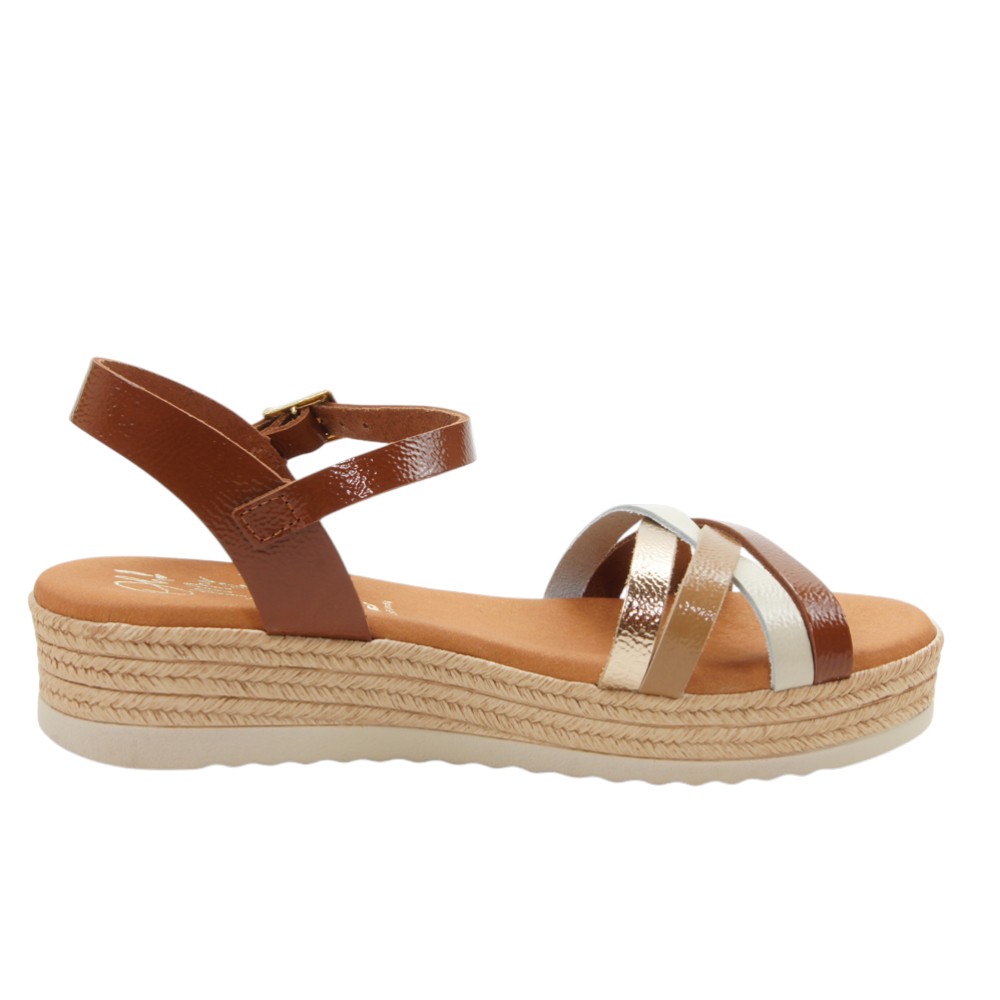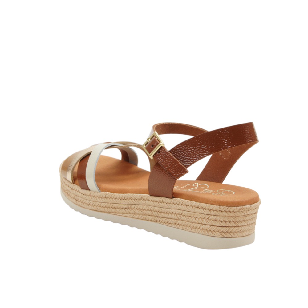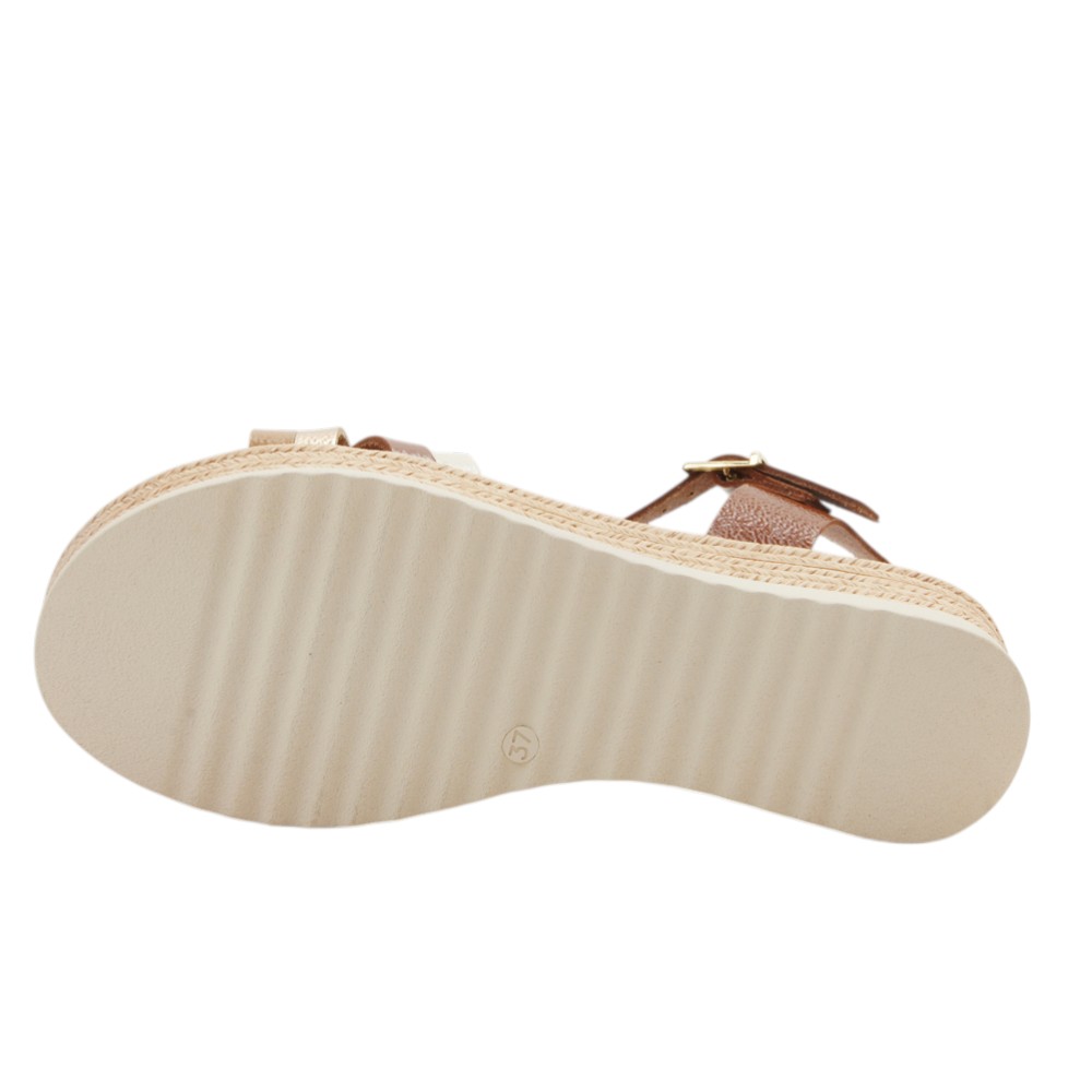 Fabricada en piel natural de alta calidad con efecto brillante y charol. Diseño con tiras cruzadas en la pala de color bronce, champán y beige. Ajustable con hebilla en la talonera. Planta de microfibra transpirable confort gel que proporciona una mayor amortiguación. Plataforma forrada en esparto. Suela de poliuretano flexible y ligero.- 36