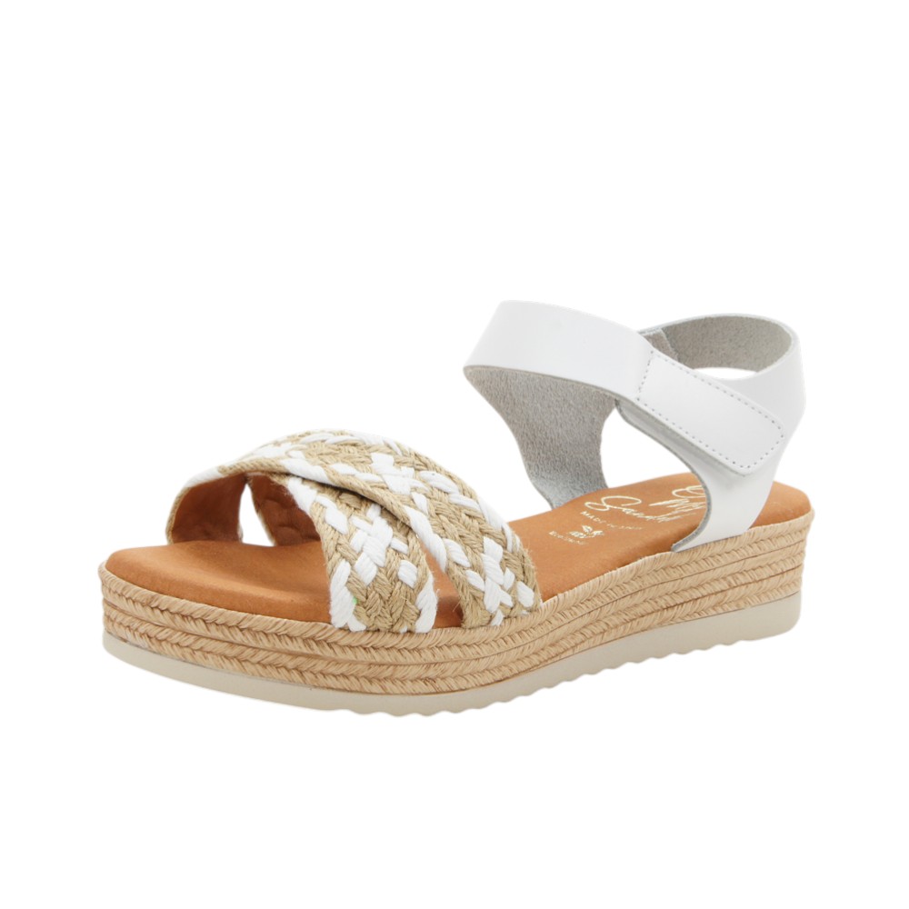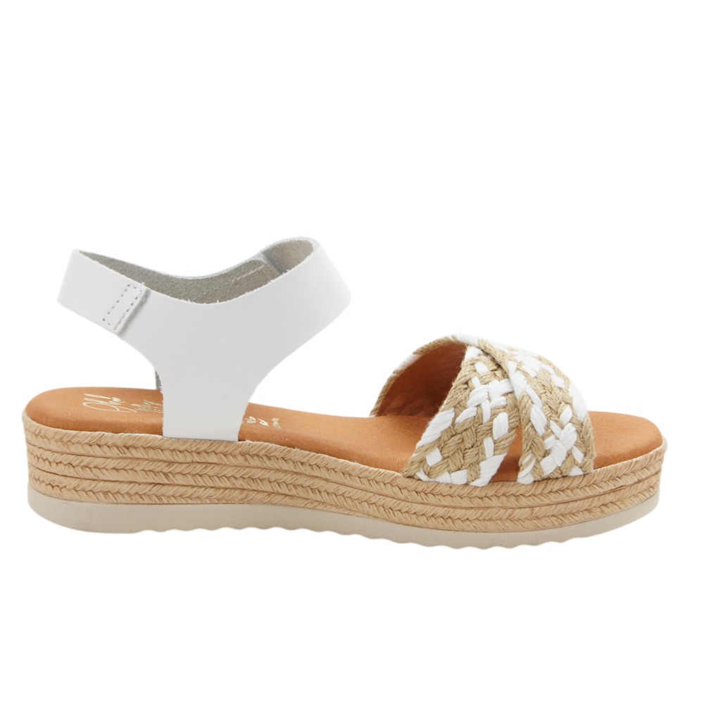 Fabricada en piel natural de alta calidad. Diseño veraniego con tiras trenzadas delanteras simulando el esparto. Ajustable con velcro en la tobillera. Planta de microfibra transpirable confort gel que proporciona una mayor amortiguación. Con plataforma forrada en esparto y lámina inferior en goma EVA antideslizante y resistente.- 35