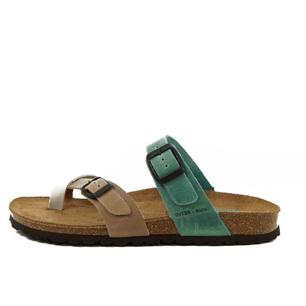 Sandalia bio tipo esclava muy suave que no molesta en el dedo. La suela está compuesta de un parte superior de corcho prensado recubierto en serraje de piel, y una parte inferior de material Extralight grueso pero muy ligero y flexible.