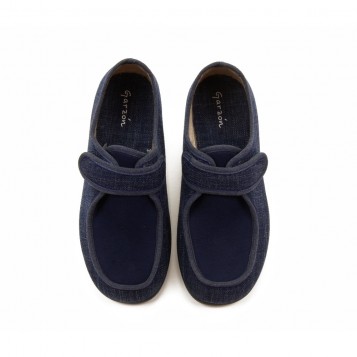 Zapatilla para casa o calle muy ancha y cómoda en tela tipo tejano azul marino envejecido.