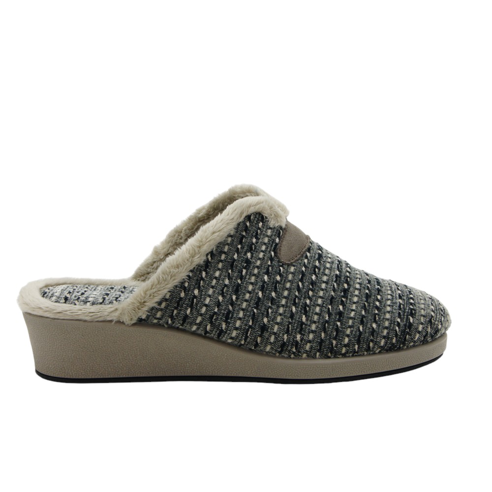 Zapatilla en suave tejido con forro interior en pelo cálido. Corte central que permite calzar pies anchos o con empeine alto. Detalle de ribete con pelo en la pala y la plantilla. Suela de lámina de goma antideslizante. Lavable a 30ºC.- 37