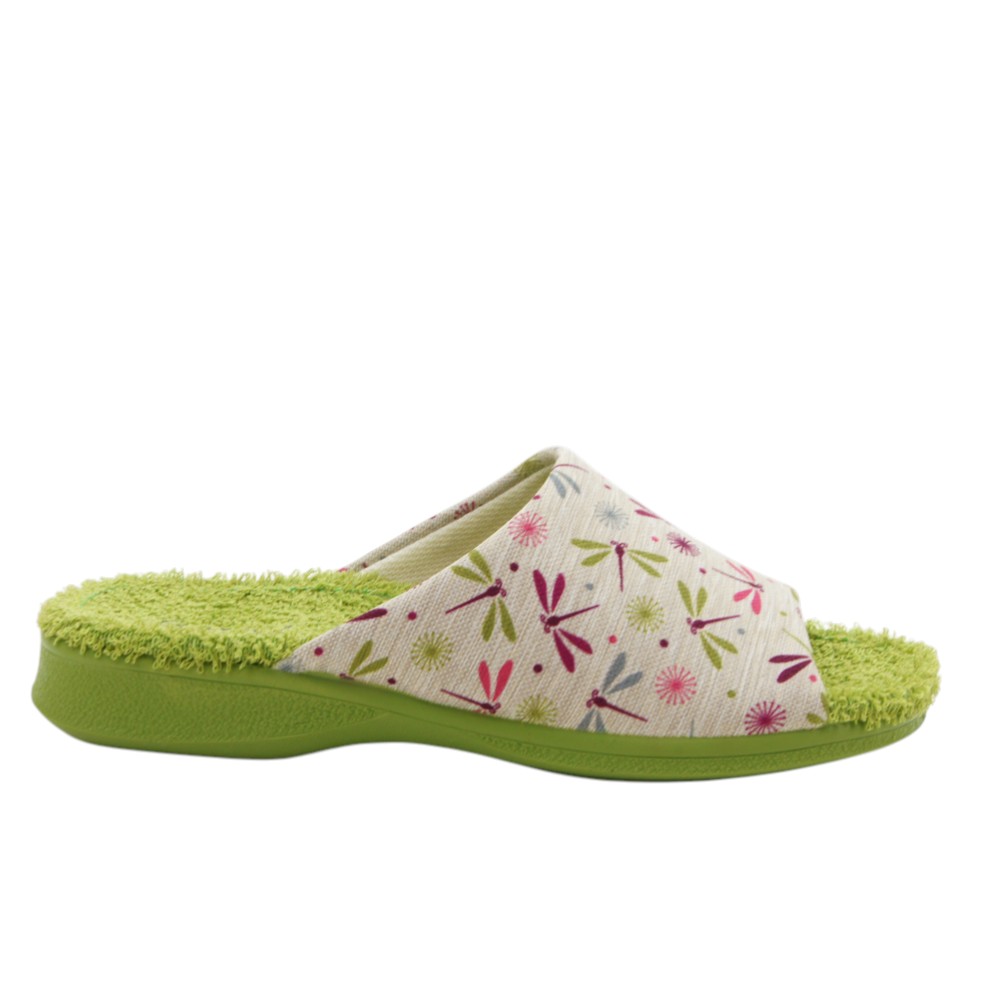 Fabricada en suave tejido con serigrafía de pájaros en la pala. Plantilla en tejido de rizo toalla que absorbe mejor el sudor y proporciona mayor frescura. Suela de goma flexible y antideslizante. Lavable a 30ºC.- 35