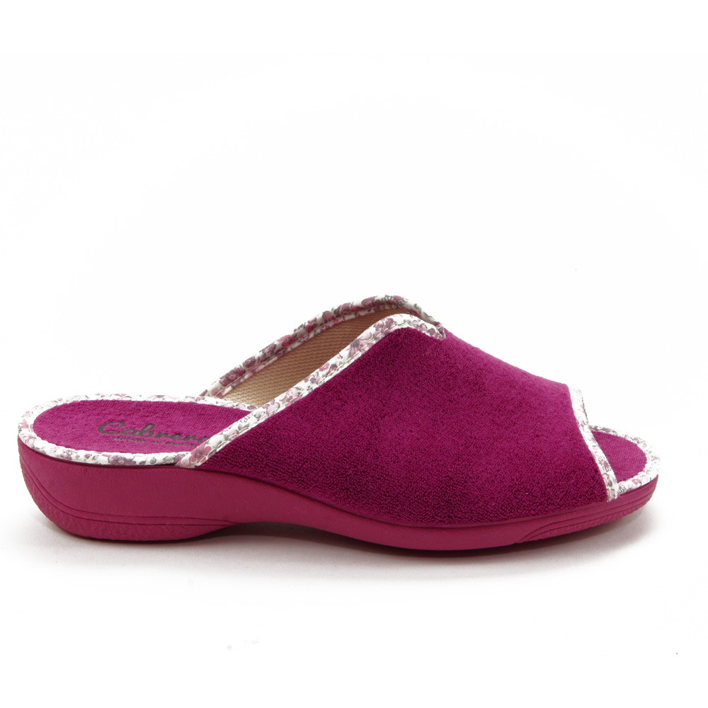 Zapatilla en suave tejido de toalla rizo. De horma ancha con corte central que permite calzar pies anchos o con empeine alto. Suela de goma flexible y antideslizante.