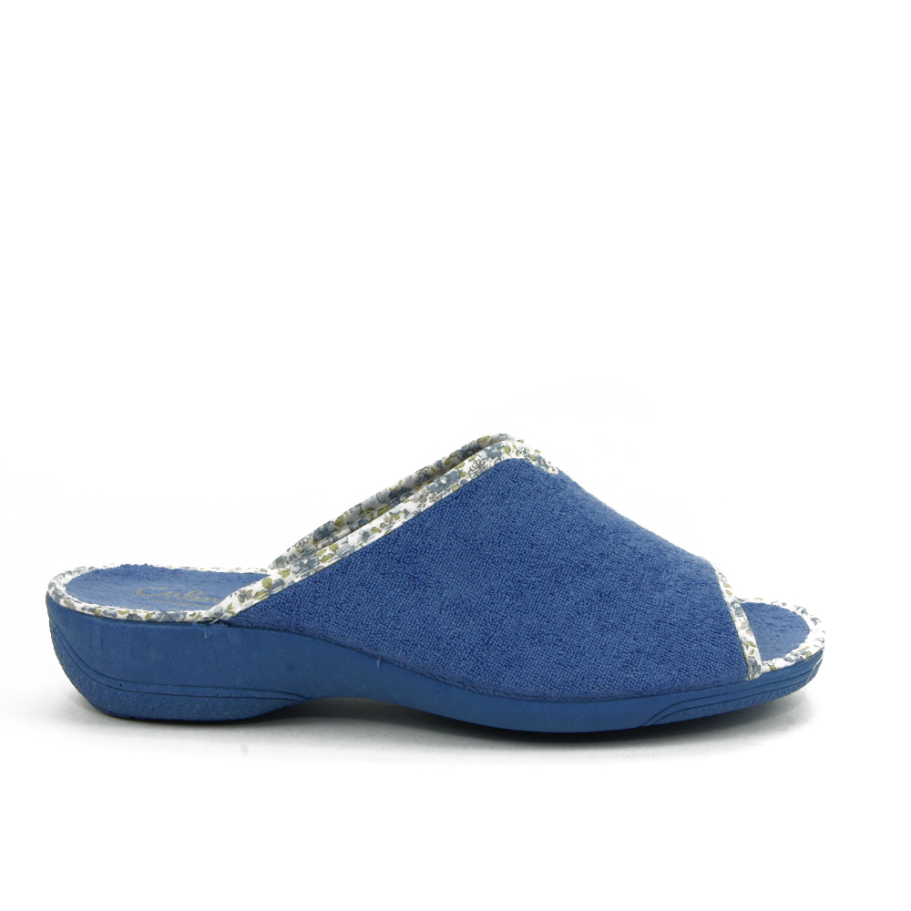 Zapatilla en suave tejido de toalla rizo. De horma ancha con corte central que permite calzar pies anchos o con empeine alto. Suela de goma flexible y antideslizante.
