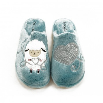 Zapatilla de casa para mujer de Garzón tipo twin con dibujo oveja y ovillo de lana sobrepuesto.