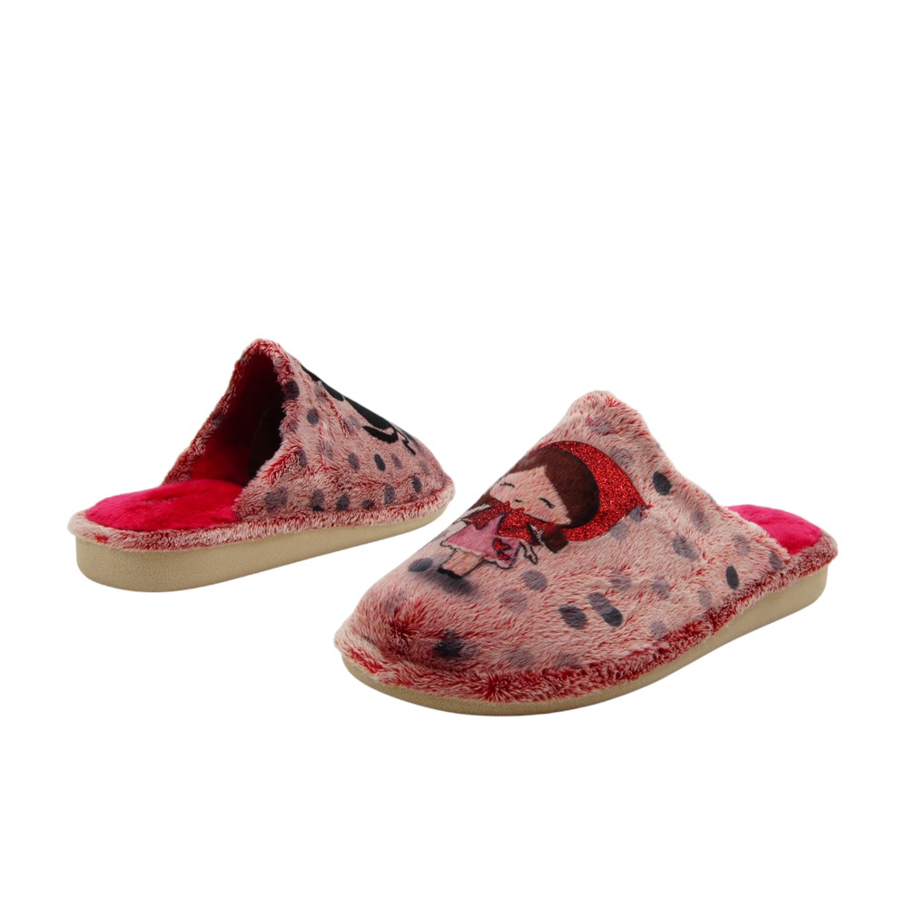 Zapatilla en suave tejido de abrigo, diseñada con divertida serigrafía tipo twin de caperucita y el lobo. Con suela ligera de microporoso ESPECIAL PARQUET, que no deja huella ni hace ruido. Una zapatilla muy cómoda y duradera. Lavable a 30ºC.-