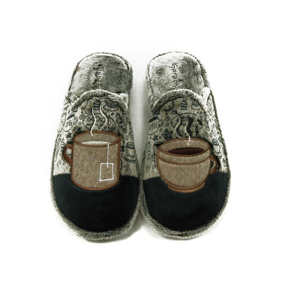 Zapatillas de estar en casa para hombre, tipo twins con divertido dibujo de taza de café y té.