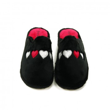 Zapatilla en terciopelo con dibujo de corazones en la pala, forro interior en suave pelo. Suela ligera de microporoso ESPECIAL PARQUET, que no deja huella ni hace ruido.