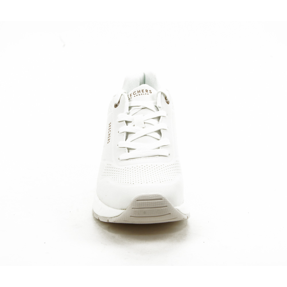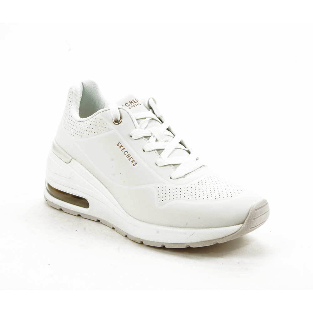 Zapato casual de mujer con cuña oculta y media suela que proporciona una mayor amortiguación ,con la comodidad de Skechers. Fabricado en piel sintética duraleather. Ajustable con cordones.