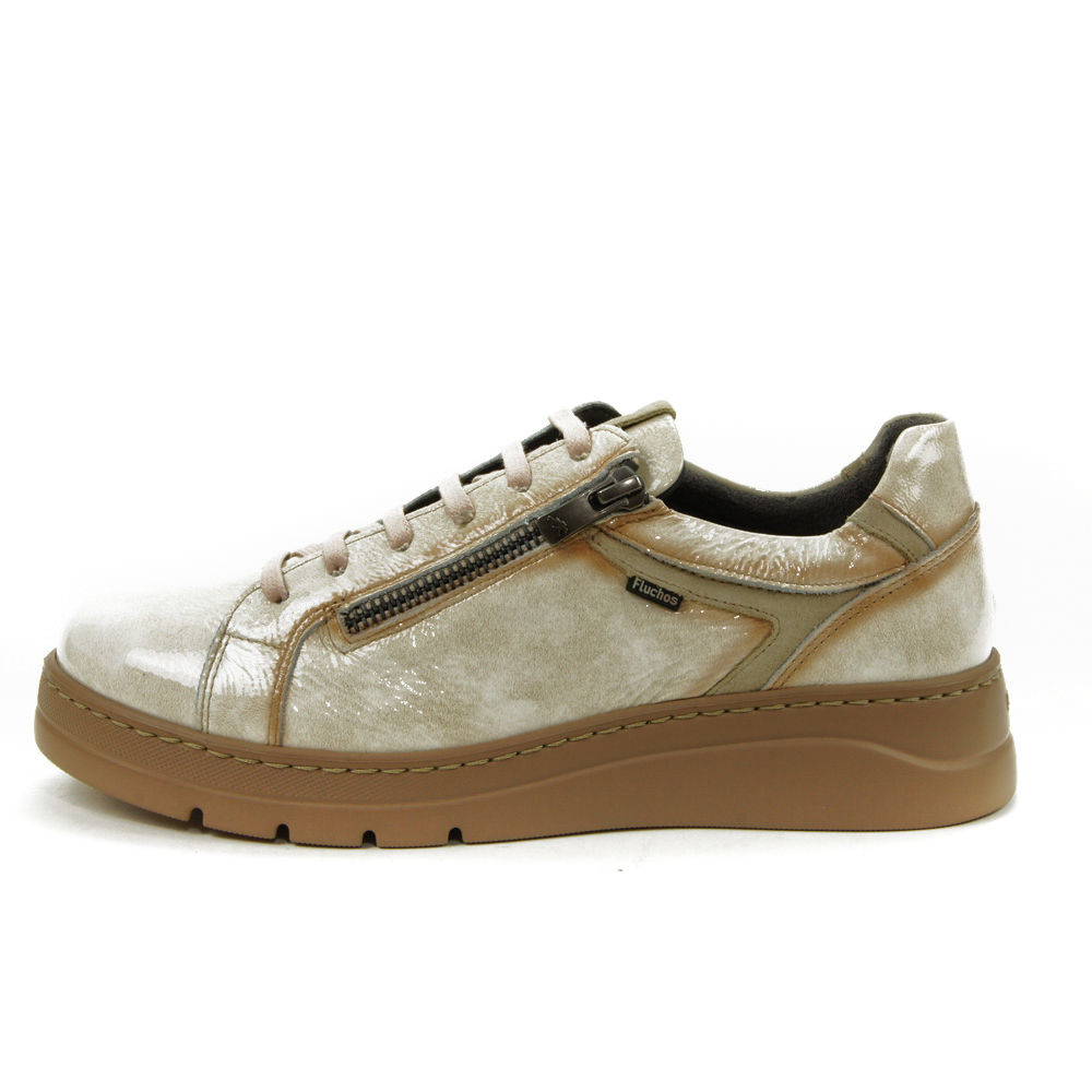 Zapato casual de mujer de Fluchos con acabado en charol. Ajustable con cremallera lateral y goma elástica para mejorar el calce diario.